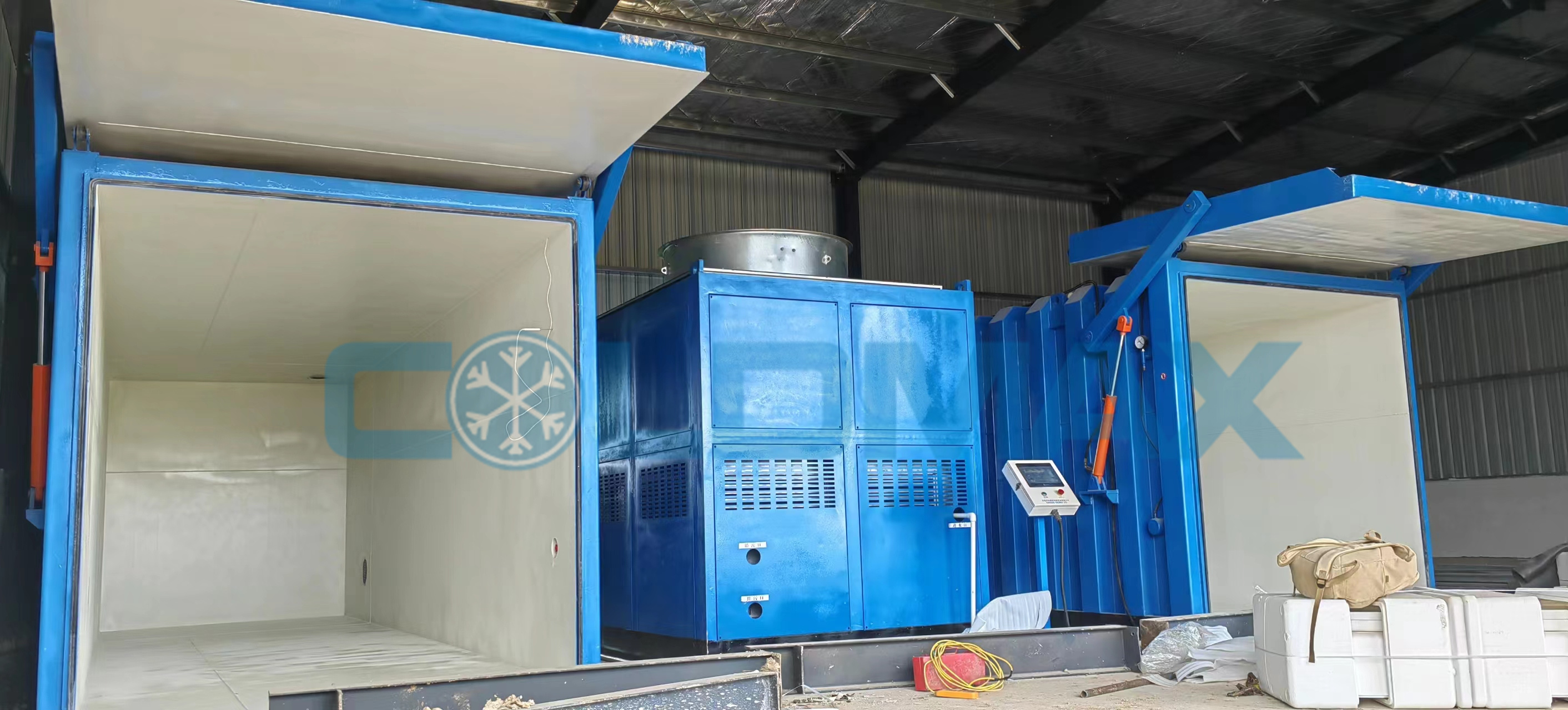安徽王總雙槽十卡板蔬菜真空預(yù)冷機(jī),雙箱體一個(gè)控制系統(tǒng),適合大型農(nóng)場(chǎng)處理量大