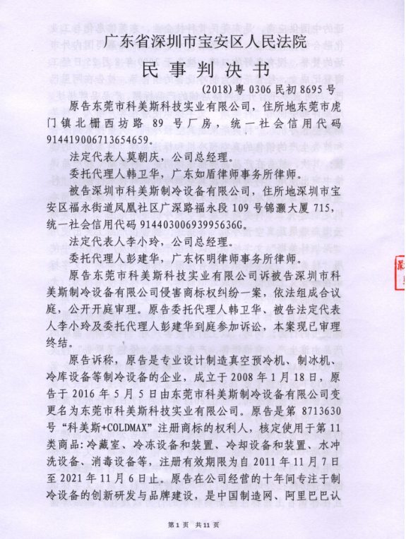 科美斯主要產(chǎn)品有果蔬真空預(yù)冷機、熟食真空快速冷卻機、冷庫系列、制冰機系列(塊冰機、管冰機、片冰機等)、農(nóng)業(yè)設(shè)備系列(自走式噴灌系統(tǒng)、滴灌帶、播種機),以上產(chǎn)品是科美斯基于2002年起積累的行業(yè)經(jīng)驗及技術(shù),并獲得多項專利;科美斯的客戶遍布全球,每年向全世界供應(yīng)超過100套制冷保鮮設(shè)備,先后在北美和墨西哥成立分公司,在俄羅斯、芬蘭、伊朗等國家設(shè)立代理商,為全球客戶提供快速完善的售后保障服務(wù)!科美斯分別于2011年、2014年和2016年在中國、澳大利亞及歐盟成功注冊“科美斯 COLDMAX”商標(biāo),并在全系產(chǎn)品使用,未授權(quán)任何其他公司使用該商標(biāo)。任何同類型的自稱“科美斯”的公司,或私自使用了“科美斯 COLDMAX”商標(biāo)的產(chǎn)品皆是抄襲或打擦邊球來混淆市場,并已對科美斯(東莞市科美斯科技實業(yè)有限公司(曾用名稱:東莞市科美斯制冷設(shè)備有限公司)及廣東科美斯農(nóng)業(yè)設(shè)備有限公司)造成了名譽和經(jīng)濟損失,我司科美斯已經(jīng)通過法律途徑維護合法權(quán)益,并成功勝訴!