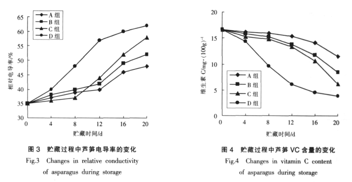細胞膜透性的大小可用組織的相對電導率來衡量,相對電導率越高,說明細胞膜透性越大。從圖3可以看出,對照組D未經預冷及MAP包裝處理,貯藏過程細胞膜透性增加很快,貯藏20d時相對電導率為62%;而蘆筍經預冷處理后,貯藏前8d細胞膜透性變化不大,但貯藏8d后細胞膜透性迅速增加。真空處理的蘆筍貯藏20d時其相對電導率最小,僅為對照組的77.4%。