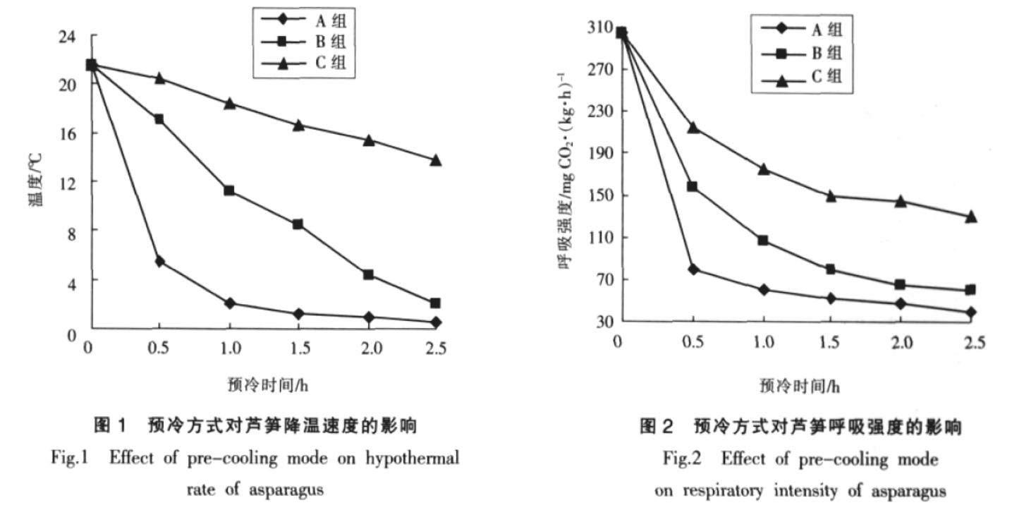 為探討預冷方式及氣調包裝貯藏對蘆筍保鮮的效果,以綠蘆筍為試材,研究了真空、冰水、冷庫自然預冷等3種不同的預冷方式并結合低溫MAP處理對采后生理、營養(yǎng)品質和感官質量的影響。結果表明:蘆筍采后未經及時預冷、未用MAP包裝入庫,貯藏8d的蘆筍因營養(yǎng)品質和感官質量急劇下降而失去商品價值;真空預冷的降溫速度最快并能顯著降低蘆筍的呼吸強度;采用低溫并結合MAP包裝處理,能有效降低細胞膜透性和粗纖維含量的增加,抑制維生素C和葉綠素含量的下降,蘆筍貯藏20d仍具有較好的感官質量與商品價值。預冷對蘆筍的貯藏效果依次為:真空預冷、冰水預冷和冷庫自然預冷。