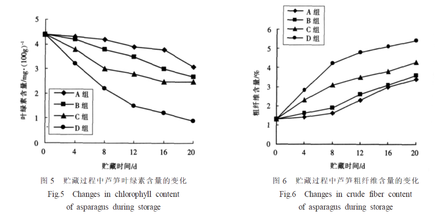 蘆筍的表皮色澤(綠色)是重要的品質感官指標。由圖5可以看出,蘆筍采后的葉綠素含量隨貯藏時間的延長而逐漸減少。A、B、C試驗組經預冷和MAP包裝處理,明顯延緩了葉綠素的分解,貯藏20d時,能較好地保持蘆筍表皮的綠色。其中經真空預冷的蘆筍表皮葉綠素含量最高,達3.1mg/100g。對照組D蘆筍僅貯藏8d,其葉綠素含量降低50%,表皮顏色褪綠變黃,影響了蘆筍的商品價值.
