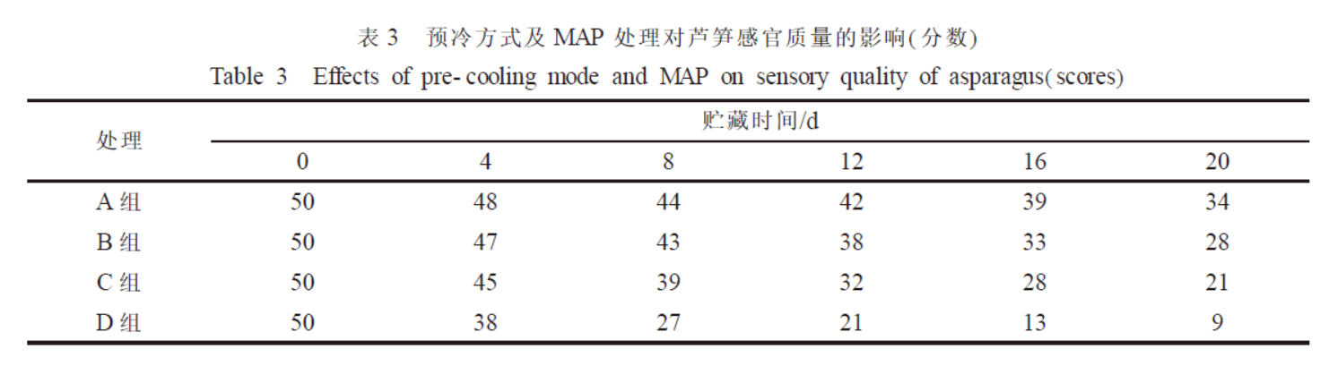 對果蔬原料的色、香、味等感官指標進行評價,是衡量果蔬保鮮效果的重要手段。從表3感官質量評分可以看出,A、B、C3個試驗組的感官指標明顯優(yōu)于對照組D。對照組未經預冷及MAP包裝,貯藏至第8天時,筍頭萎蔫且呈水漬狀,失水嚴重,色澤變黃而失去商品價值。蘆筍采用不同的方式預冷,其貯藏效果也存在差異。真空預冷的蘆筍感官評分最高34分,品質最好,貯藏20d時仍具有較好的商品價值;其次為冰水預冷的蘆筍;最后為冷庫自然預冷的蘆筍。
