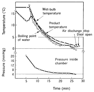真空預(yù)冷是將果蔬、鮮花、肉類(lèi)、熟食等農(nóng)產(chǎn)品置于保溫的真空室里,用真空泵對(duì)室內(nèi)抽真空。當(dāng)室內(nèi)真空度達(dá)到果蔬溫度對(duì)應(yīng)的水蒸汽的飽和壓力時(shí),果蔬等農(nóng)產(chǎn)品表面間隙中的水分開(kāi)始蒸發(fā),蒸發(fā)時(shí)將帶走蒸發(fā)潛熱,使農(nóng)產(chǎn)品溫度降低,進(jìn)一步降壓,直至果蔬冷卻至所需的溫度。