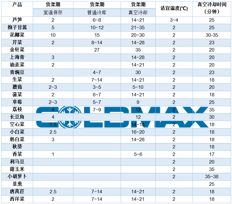 生鮮果蔬真空預(yù)冷、氣調(diào)包裝和普通冷藏保質(zhì)期對(duì)比表(單位:天)