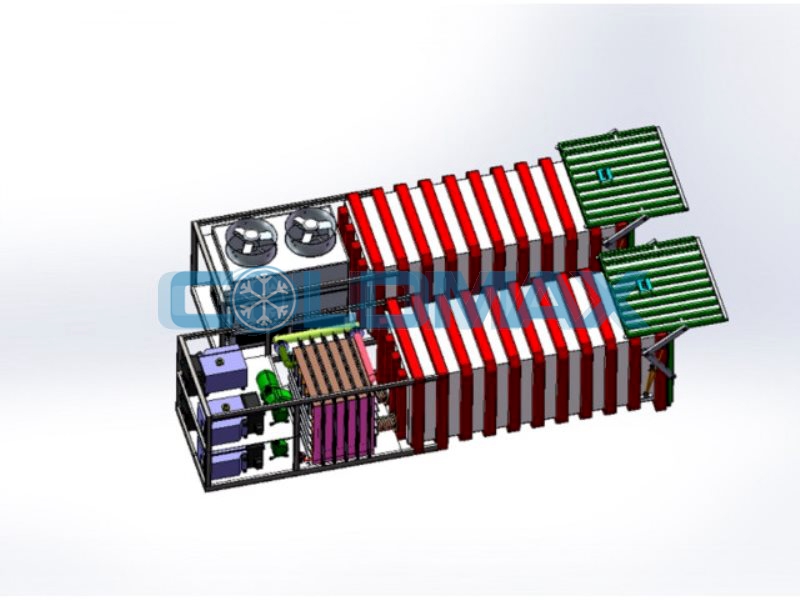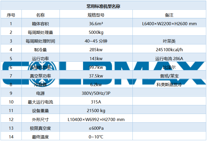 十卡板果蔬真空預(yù)冷機(jī)主要針對中大型農(nóng)場的預(yù)冷加工使用;真空箱容積36.6m3,庫容量5000kg,預(yù)冷溫度設(shè)計(jì)為0~10℃;