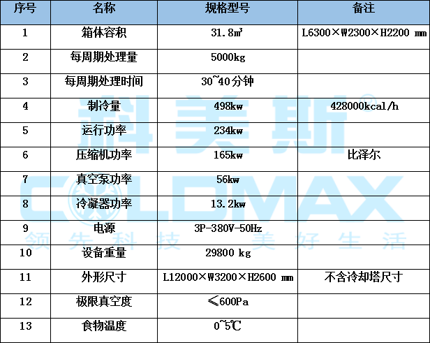 CVF-5000 型號食品快速冷卻機(jī)每周期處理食品量為5000kg,處理時間10~20分鐘;