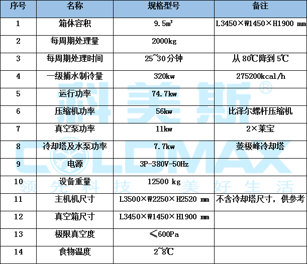 CVF-2000 型號食品快速冷卻機每周期處理食品量為2000kg,處理時間10~20分鐘;