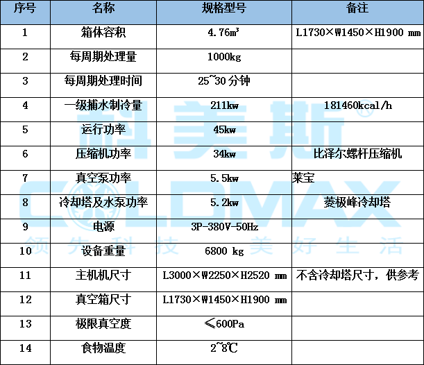 CVF-1000 型號食品快速冷卻機每周期處理食品量為1000kg,處理時間10~20分鐘;