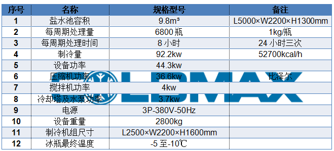 冰瓶機通常使用鹽水間接式制冷。將裝有水的塑料瓶放入鹽水池中,蓋上鹽水池蓋板,設備啟動后,制冷機組開始運行;塑料瓶中的水先于鹽水池中的鹽水凝結成冰,從而實現冰瓶的制作。