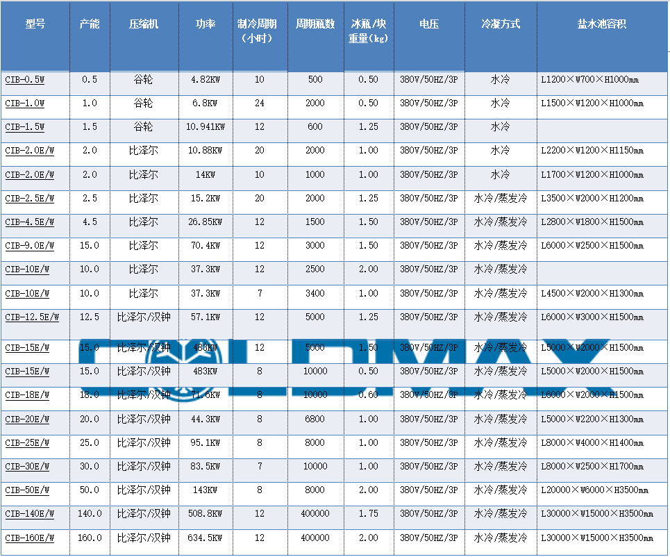 產品介紹冰瓶機是制冰機中的一種,與其它制冰機相比,區(qū)別在于生產出的冰是裝在塑料瓶中,主要用于需要冷卻但不允許帶入融化水的特殊場合,用的最多是在蔬菜運輸過程中的保鮮。廣泛應用于工廠降溫、長途運輸、水產食品保鮮、水果蔬菜保鮮、特殊領域的降溫冷卻等CIB-20E/W 型號冰瓶機日產量:20T 20400瓶,每瓶1.0kg;工作原理冰瓶機通常使用鹽水間接式制冷。將裝有水的塑料瓶放入鹽水池中,蓋上鹽水池蓋板,設備啟