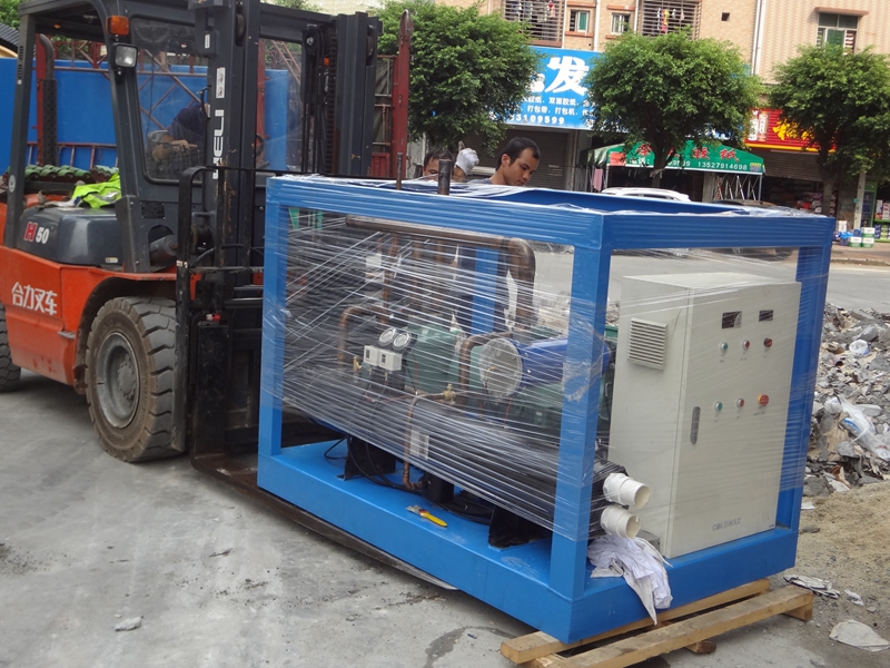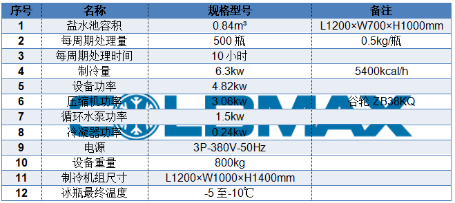 冰瓶機(jī)通常使用鹽水間接式制冷。將裝有水的塑料瓶放入鹽水池中,蓋上鹽水池蓋板,設(shè)備啟動(dòng)后,制冷機(jī)組開始運(yùn)行;塑料瓶中的水先于鹽水池中的鹽水凝結(jié)成冰,從而實(shí)現(xiàn)冰瓶的制作。