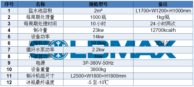冰瓶機(jī)通常使用鹽水間接式制冷。將裝有水的塑料瓶放入鹽水池中,蓋上鹽水池蓋板,設(shè)備啟動(dòng)后,制冷機(jī)組開始運(yùn)行;塑料瓶中的水先于鹽水池中的鹽水凝結(jié)成冰,從而實(shí)現(xiàn)冰瓶的制作。