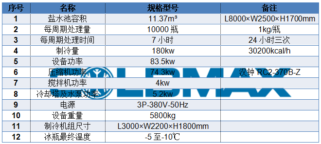 冰瓶機通常使用鹽水間接式制冷。將裝有水的塑料瓶放入鹽水池中,蓋上鹽水池蓋板,設備啟動后,制冷機組開始運行;塑料瓶中的水先于鹽水池中的鹽水凝結成冰,從而實現(xiàn)冰瓶的制作。