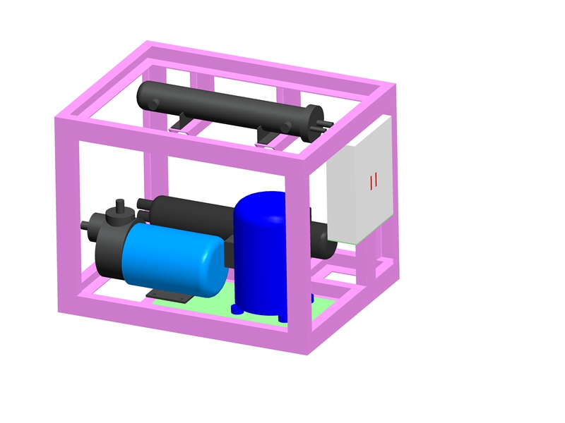 冰瓶機通常使用鹽水間接式制冷。將裝有水的塑料瓶放入鹽水池中,蓋上鹽水池蓋板,設(shè)備啟動后,制冷機組開始運行;塑料瓶中的水先于鹽水池中的鹽水凝結(jié)成冰,從而實現(xiàn)冰瓶的制作。