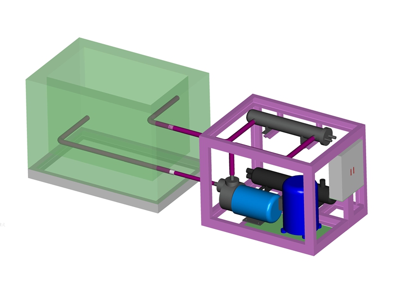 冰瓶機(jī)通常使用鹽水間接式制冷。將裝有水的塑料瓶放入鹽水池中,蓋上鹽水池蓋板,設(shè)備啟動后,制冷機(jī)組開始運(yùn)行;塑料瓶中的水先于鹽水池中的鹽水凝結(jié)成冰,從而實(shí)現(xiàn)冰瓶的制作。