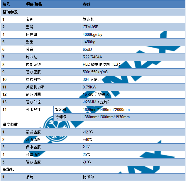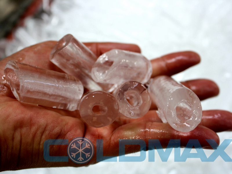 ●管冰呈中空圓柱形狀,外直徑尺寸為φ26mm、φ28mm、φ30mm、φ34mm等多種規(guī)格,長度27~50mm不等。內(nèi)孔直徑可根據(jù)制冰時間調(diào)整,一般控制在φ5~10mm之間。