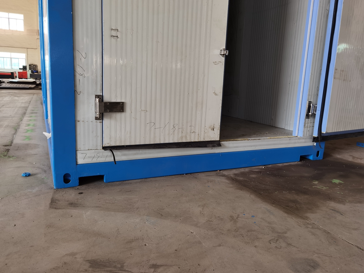 隔熱箱體,根據(jù)果蔬壓差預(yù)冷的需要,通過(guò)特殊設(shè)計(jì),箱體前端設(shè)有安裝制冷壓縮機(jī)組、冷凝器和電控箱的框架,其支柱與箱體支柱為一體;箱體后端為雙開合頁(yè)門,便于果蔬進(jìn)出。箱體采用輕質(zhì)且高強(qiáng)度的鍍鋅鋼作主框架,用鋁合金桿件或鋼板壓型桿件構(gòu)成上、下側(cè)梁箱門結(jié)構(gòu);箱內(nèi)壁、底板、頂板和門均由不銹鋼板制造:箱體六個(gè)面均采用聚氨酯板作隔熱材料。
