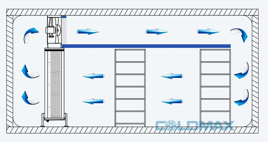 壓差預(yù)冷系統(tǒng)中主要由;冷風(fēng)機(jī)、壓差風(fēng)機(jī)、靜壓箱、包裝箱和預(yù)冷庫(kù)組成。要進(jìn)行壓差預(yù)冷首先選取預(yù)冷產(chǎn)品,將產(chǎn)品進(jìn)行凈污處理。拿農(nóng)作物來(lái)說(shuō),帶有的泥沙量越多預(yù)冷效果越差。之后將產(chǎn)品放入包裝箱內(nèi),啟動(dòng)壓差風(fēng)機(jī)使包裝箱兩側(cè)產(chǎn)生靜壓差,之后啟動(dòng)冷風(fēng)機(jī),冷風(fēng)在壓差的作用下流過(guò)包裝箱與產(chǎn)品直接接觸換熱。通過(guò)調(diào)節(jié)靜壓箱內(nèi)變頻風(fēng)機(jī)的頻率控制靜壓的大小。冷風(fēng)從包裝箱了另一側(cè)流出再進(jìn)入冷風(fēng)機(jī)形成循環(huán)。實(shí)現(xiàn)產(chǎn)品的預(yù)冷。