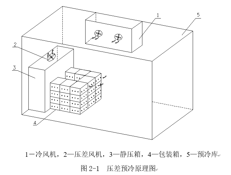 壓差預(yù)冷是空氣預(yù)冷的一種新形式,其原理圖(如2-1),它是利用壓差風(fēng)機(jī)的抽吸作用,在包裝容器的兩側(cè)形成一定的壓力差,使冷空氣經(jīng)過(guò)包裝容器上的通風(fēng)孔強(qiáng)制通過(guò)包裝容器內(nèi)部與預(yù)冷產(chǎn)品表面直接進(jìn)行換熱,從而使物品快速、均勻的冷卻到工藝要求的溫度范圍的預(yù)冷方法