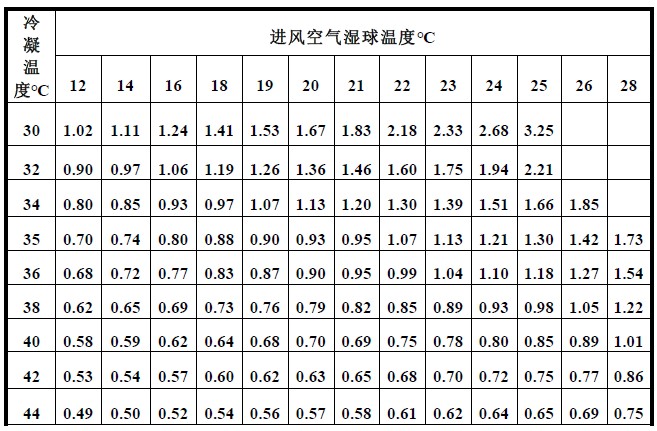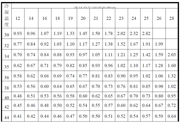 由排熱系數(shù)表中查得冷凝溫度35℃,濕球溫度25℃時(shí)的排熱系數(shù)為1.18。