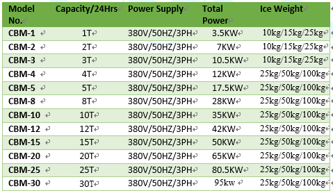塊冰機(jī)的型號(hào): 標(biāo)準(zhǔn)型號(hào)見下表,如果需要特殊型號(hào)和尺寸,請(qǐng)聯(lián)系科美斯銷售員
