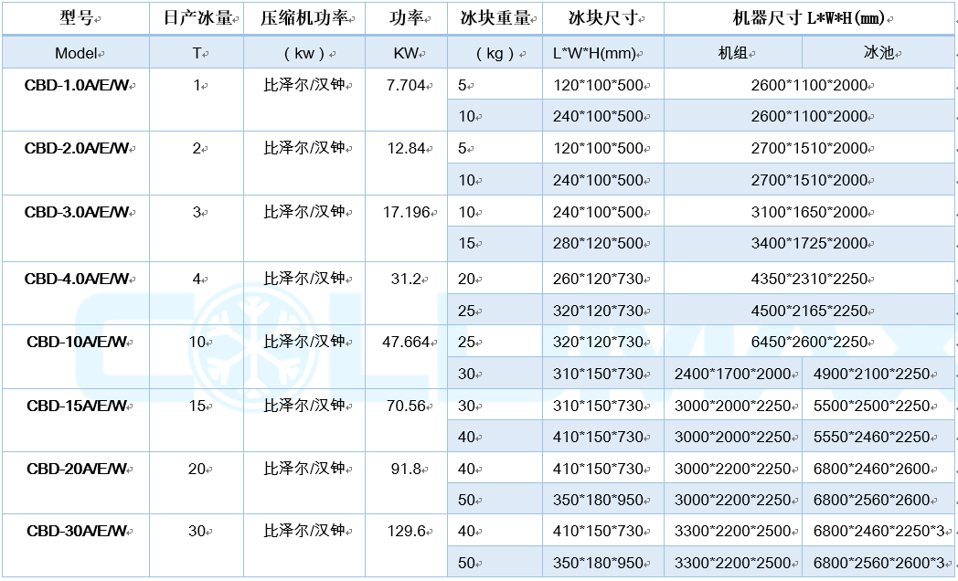 塊冰機的型號: 標準型號見下表,如果需要特殊型號和尺寸,請聯(lián)系科美斯銷售員