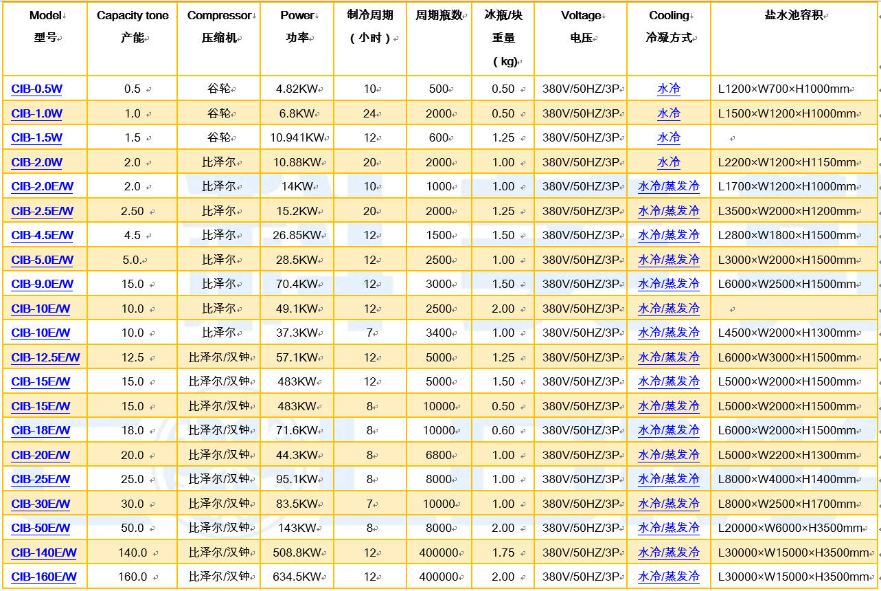 冰瓶機(jī)的型號(hào): 標(biāo)準(zhǔn)型號(hào)見下表,如果需要特殊型號(hào)和尺寸,請(qǐng)聯(lián)系科美斯銷售員