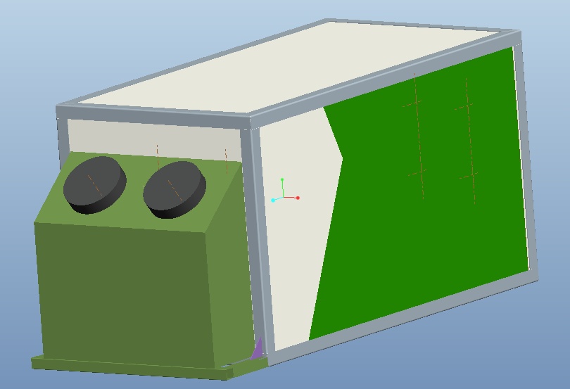 隔熱箱體,根據(jù)果蔬保鮮的需要,通過特殊設計,箱體前端設有安裝制冷壓縮機組、冷凝器和電控箱的框架,其支柱與箱體支柱為一體;箱體后端為雙開合頁門,便于果蔬進出。箱體采用輕質且高強度的鍍鋅鋼作主框架,用鋁合金桿件或鋼板壓型桿件構成上、下側梁箱門結構;箱內(nèi)壁、底板、頂板和門均由不銹鋼板制造:箱體六個面均采用聚氨酯板作隔熱材料。